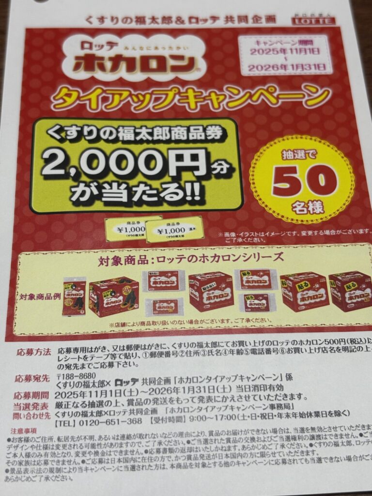 (毎年くすりの福太郎でこの時期見るキャンペーンです。年末年始の初詣や福袋朝から並ぶ時に必ずホカロン愛用してます。必要なものを購入しつつ、懸賞はがきが作れるのはうれしいです。当たったらもっと嬉しい(^^♪)