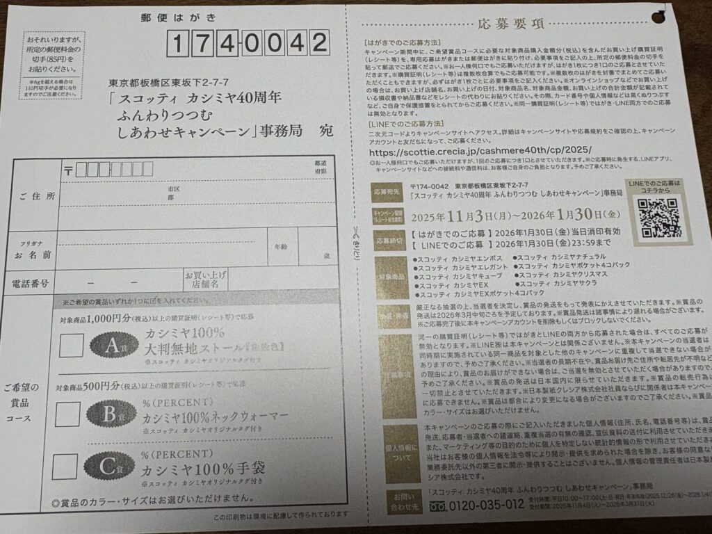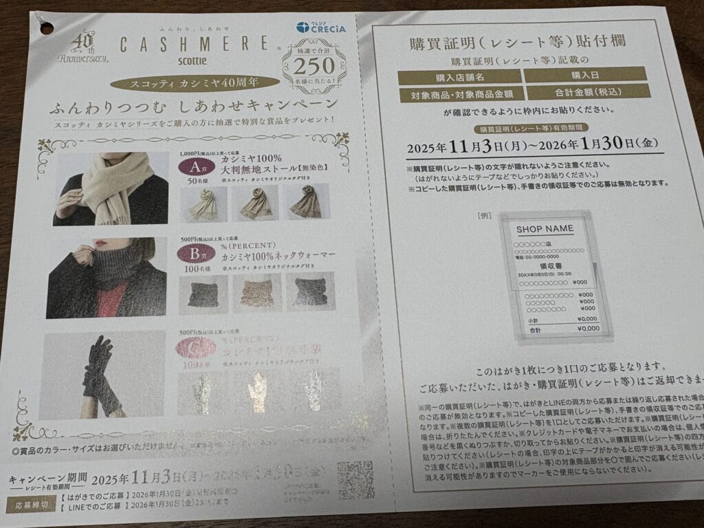 スコッティカシミヤ40周年ふんわりつつむしあわせキャンペーン 懸賞 X Facebook はてブ LINE コピー 2025.12.09 懸賞妻 こんにちは。懸賞妻です。 ★スコッティカシミヤ40周年ふんわりつつむしあわせキャンペーン2025年11月3日(月)~2026年1月30日(金)応募締め切り2026年1月30日(金)